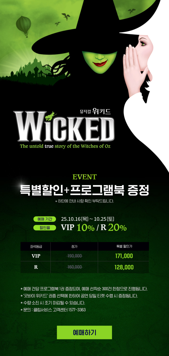 특별할인 이벤트 목록버튼 이벤트 상세내용 제목 뮤지컬 〈위키드〉 내한 공연(WICKED The Musical) 특별할인+프로그램북 증정 이벤트 등록일 2025-10-15 조회수 238 목록버튼