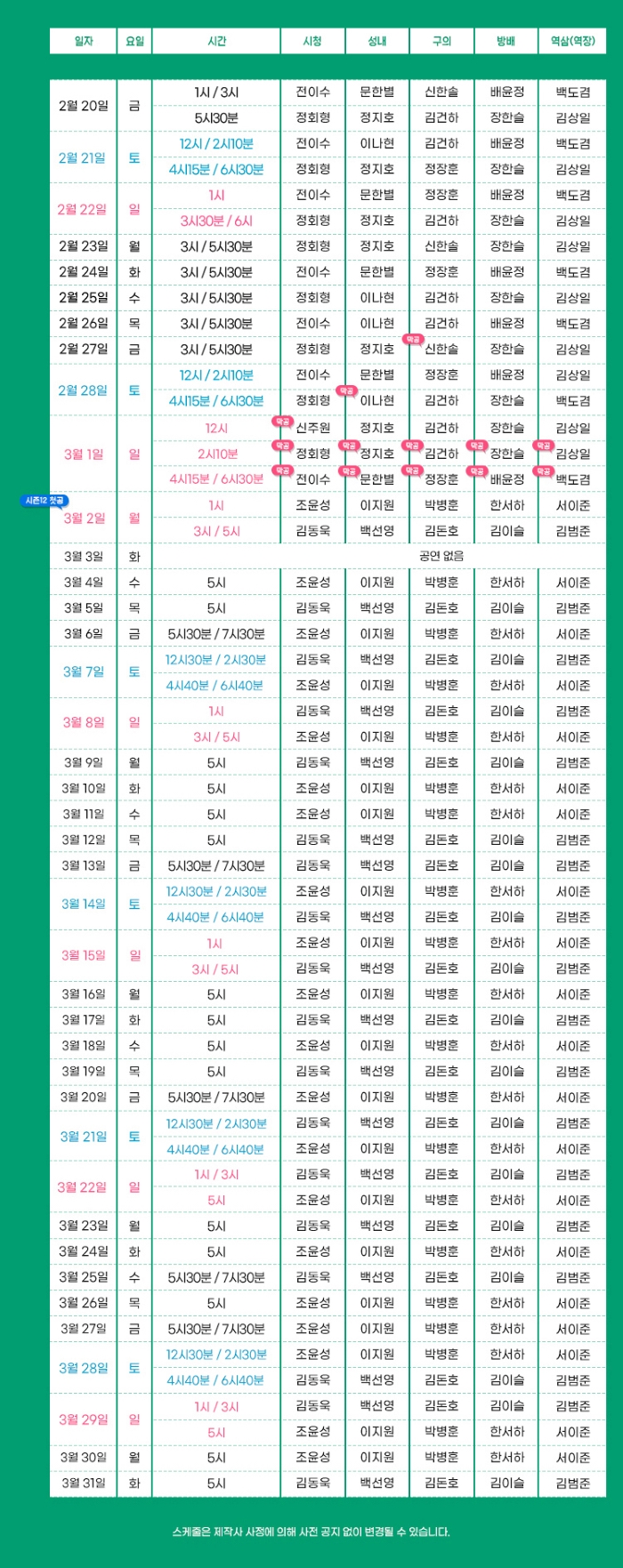 - [2월]월~금 오후 3시, 5시30분 / 토 12시, 2시10분, 4시15분, 6시30분 / 일 1시, 3시30분, 6시