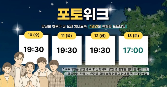 - 수~금 오후 7시30분 / 토 2시, 5시 / 일 2시 (월, 화 공연 없음)