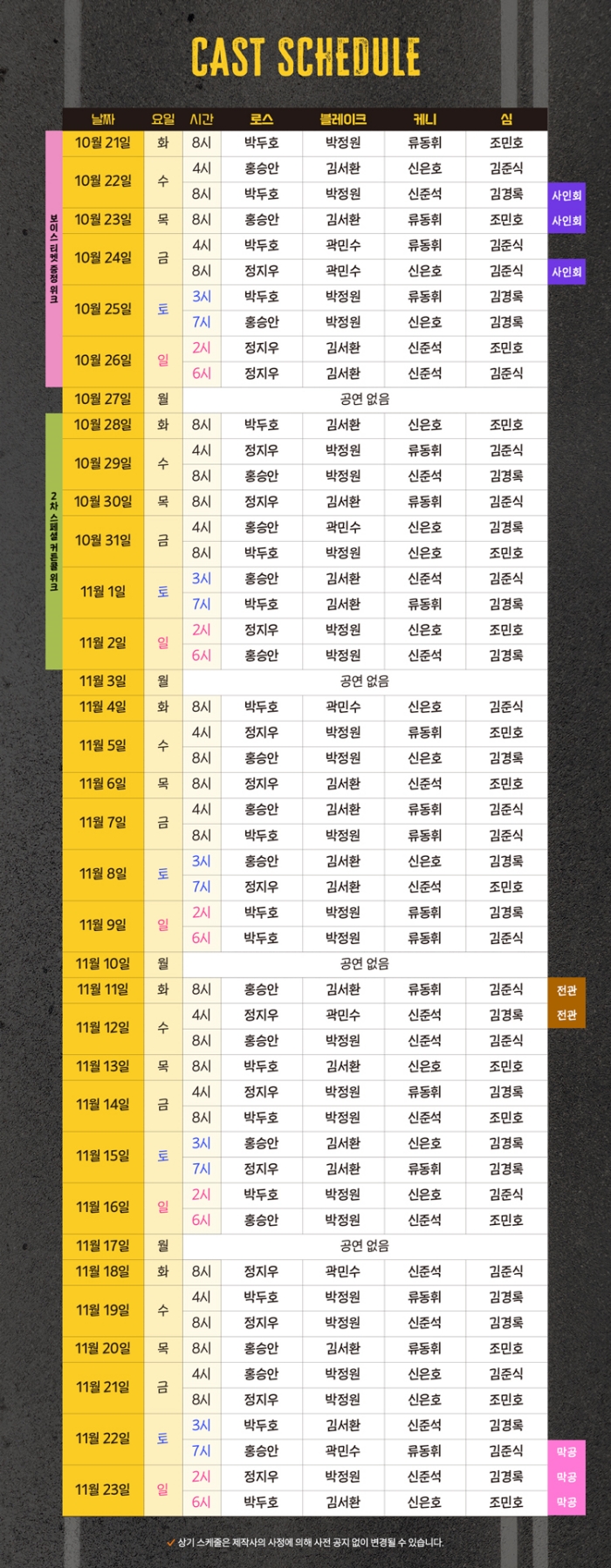 - 화, 목, 금 오후 8시 / 수 4시, 8시 / 토 3시, 7시 / 일, 공휴일 2시, 6시 (월 공연없음)