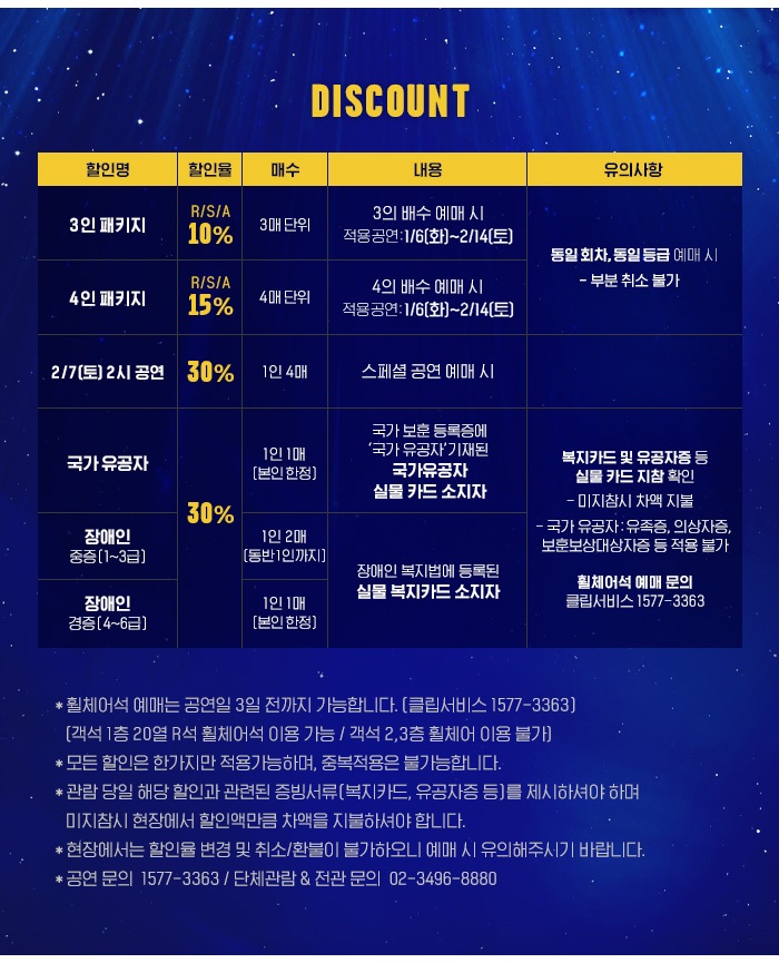 티켓오픈 시점부터 1시간 동안 고객센터를 통한 전화예매는 불가한 점 양해 부탁드립니다.