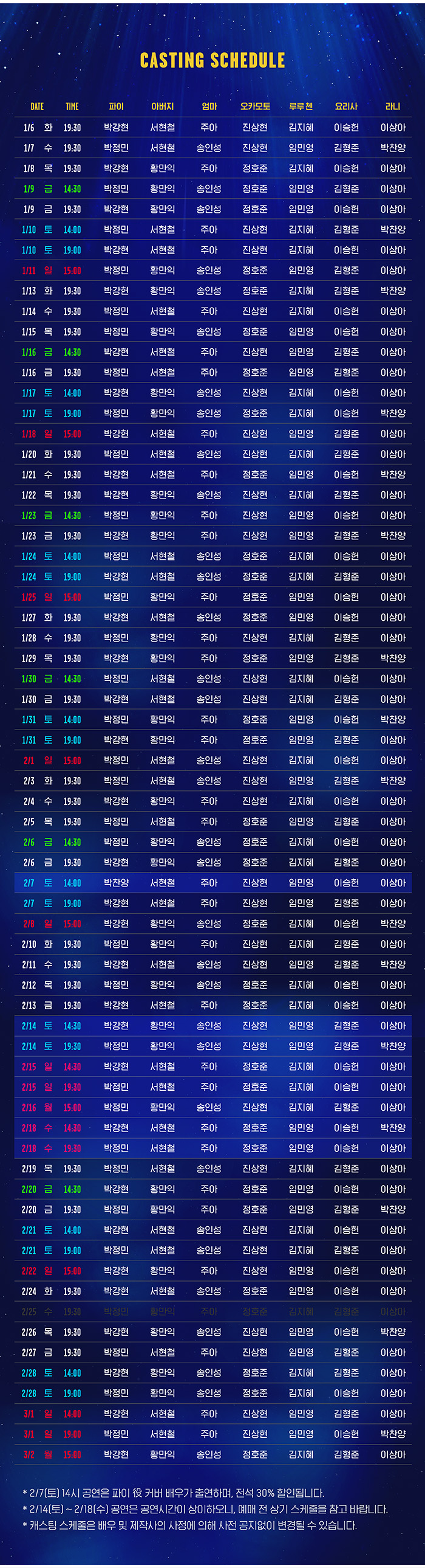 - 화,수,목 오후 7시 30분 / 금 오후 2시 30분, 7시 30분 / 토 오후 2시, 7시 / 일 오후 3시 (월 공연 없음)