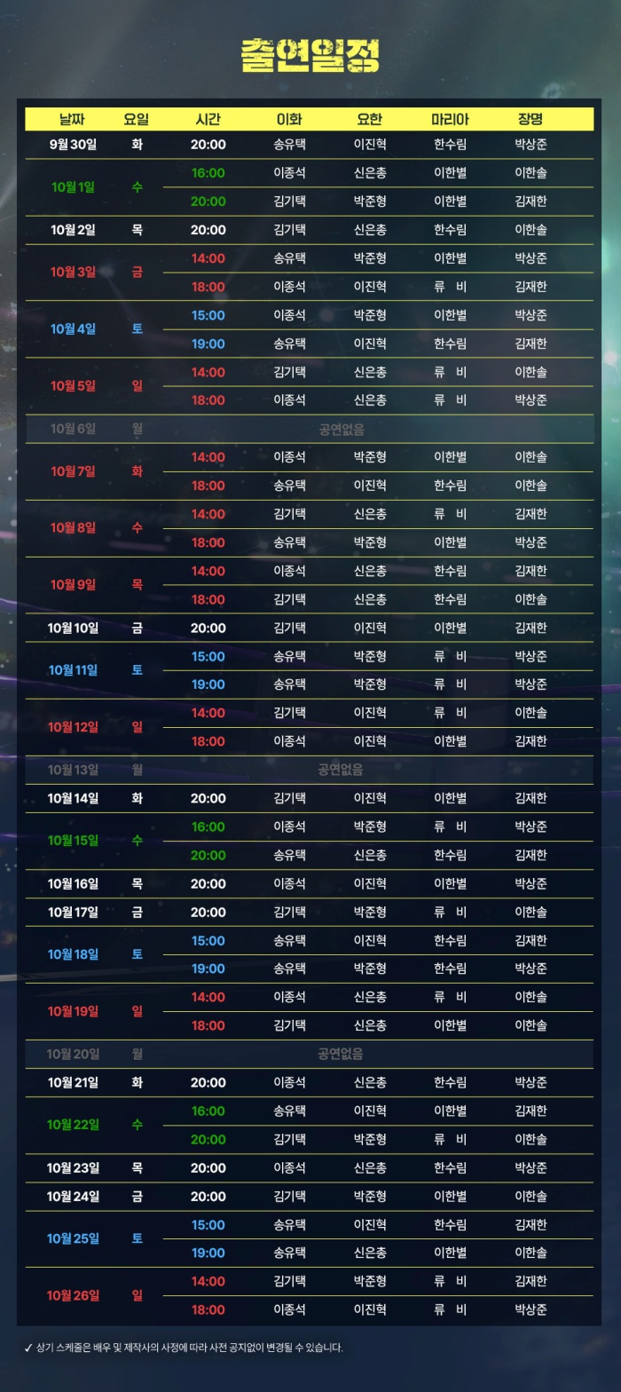 - 화, 목, 금 오후 8시 / 수 4시, 8시 / 토 3시, 7시 / 일, 공휴일 2시, 6시 (월 공연없음)