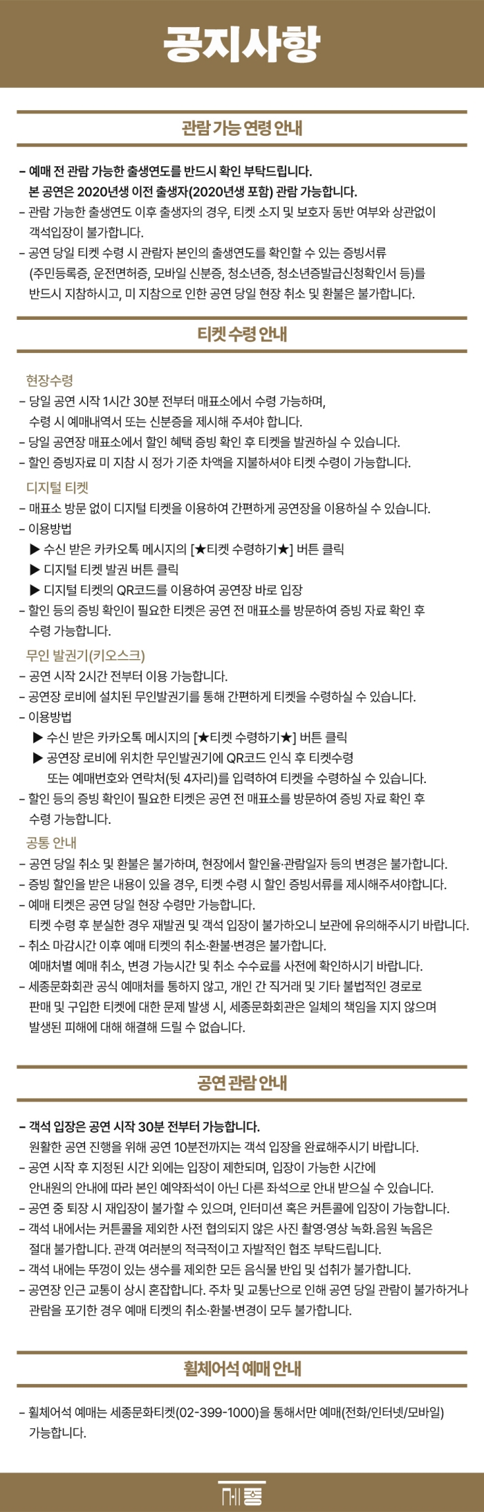 판매자(발행자) 재단법인 세종문화회관 고객문의(소비자상담) 세종문화티켓 02-399-1000