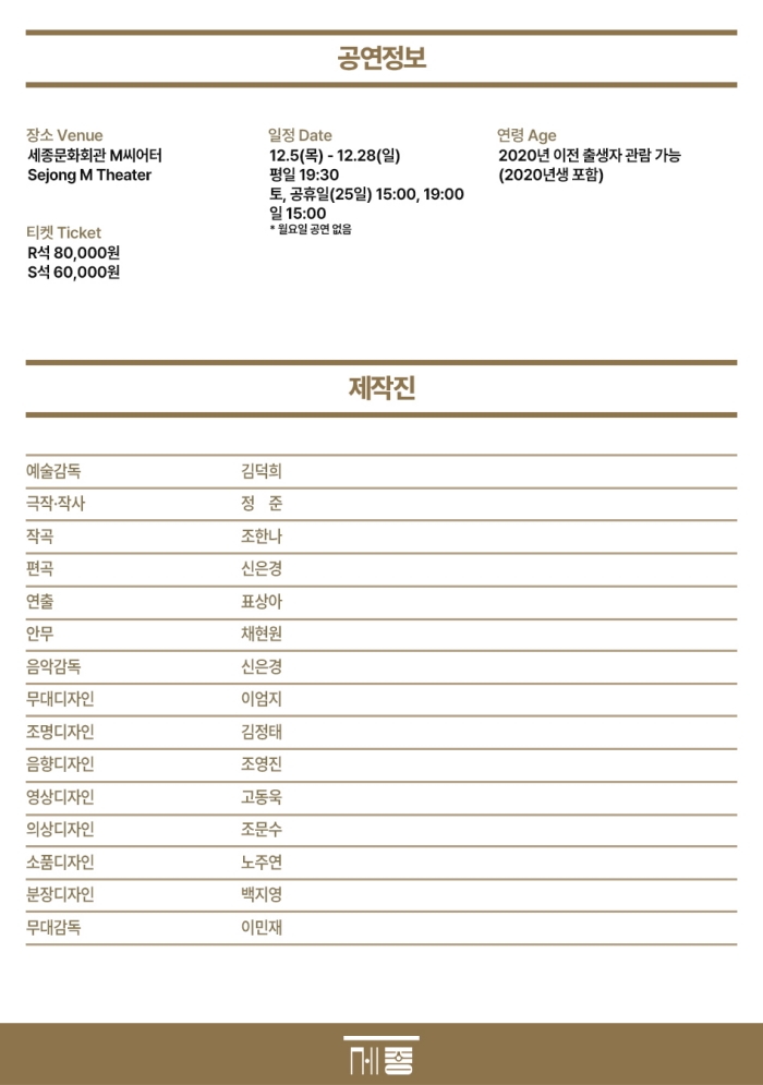 화~금 오후 7시30분 / 토, 공휴일 3시, 7시 / 일 3시 (월 공연없음)