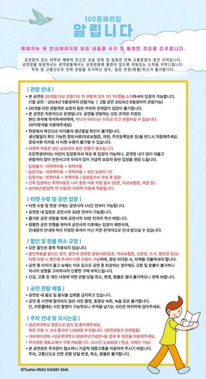 - 화, 수, 목 오전 11시, 오후 2시 / 금, 토, 일 오전 11시, 오후 2시, 4시30분 (월 공연없음)