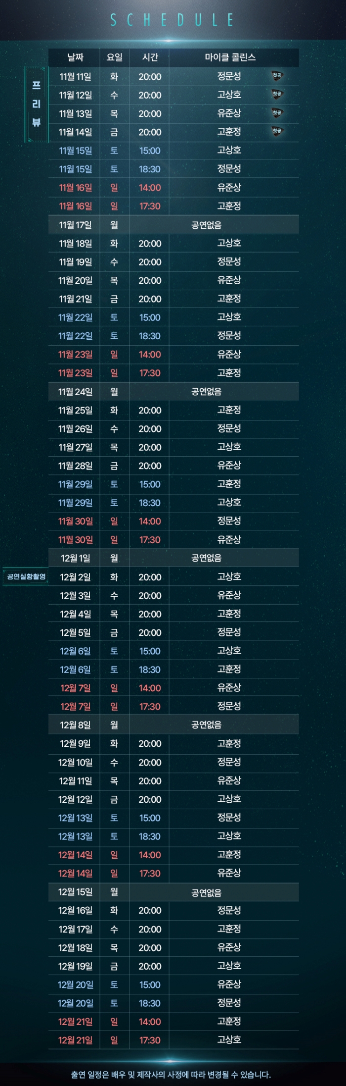 - 화~금 오후 8시 / 토 3시, 6시30분 / 일, 공휴일 2시, 5시30분 (월 공연없음)