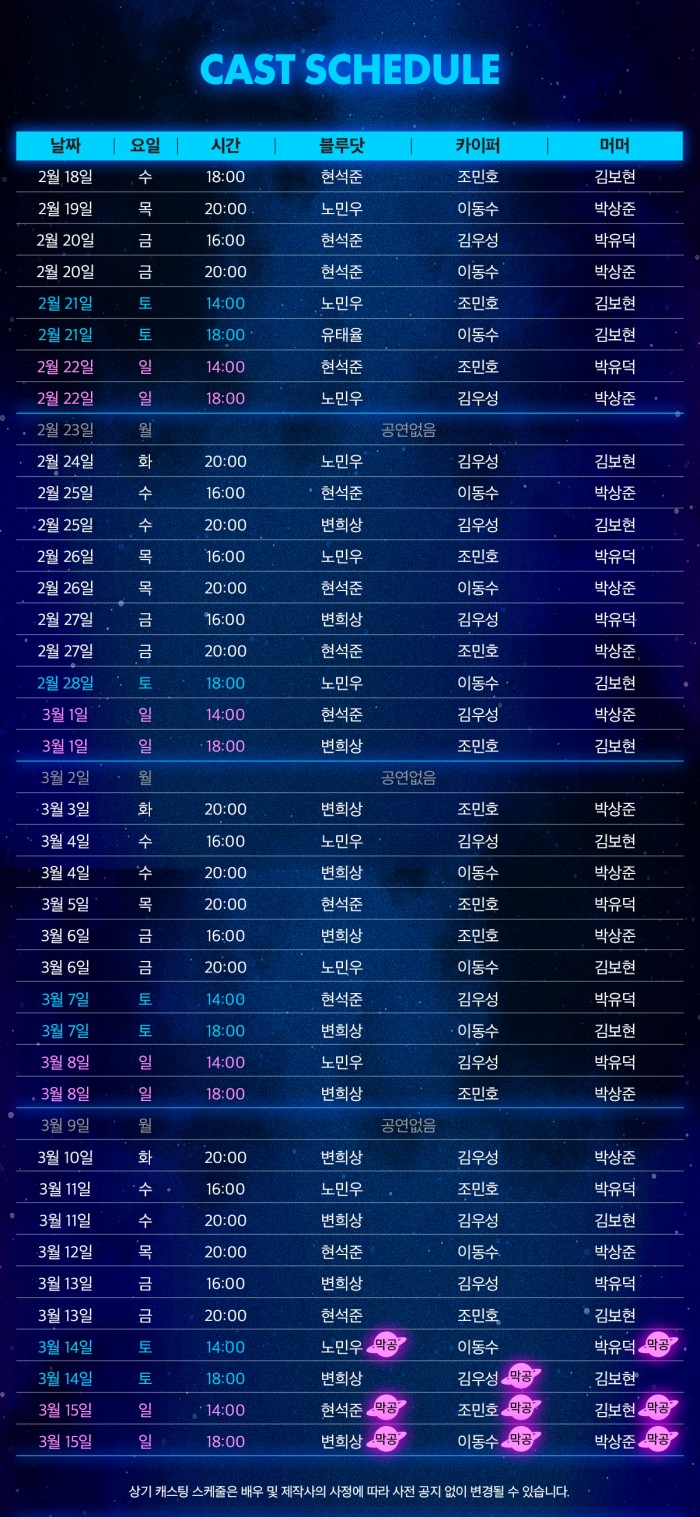 - 화, 수, 목, 금 오후 8시 / 토, 일, 공휴일 2시, 6시 (월 공연 없음)
