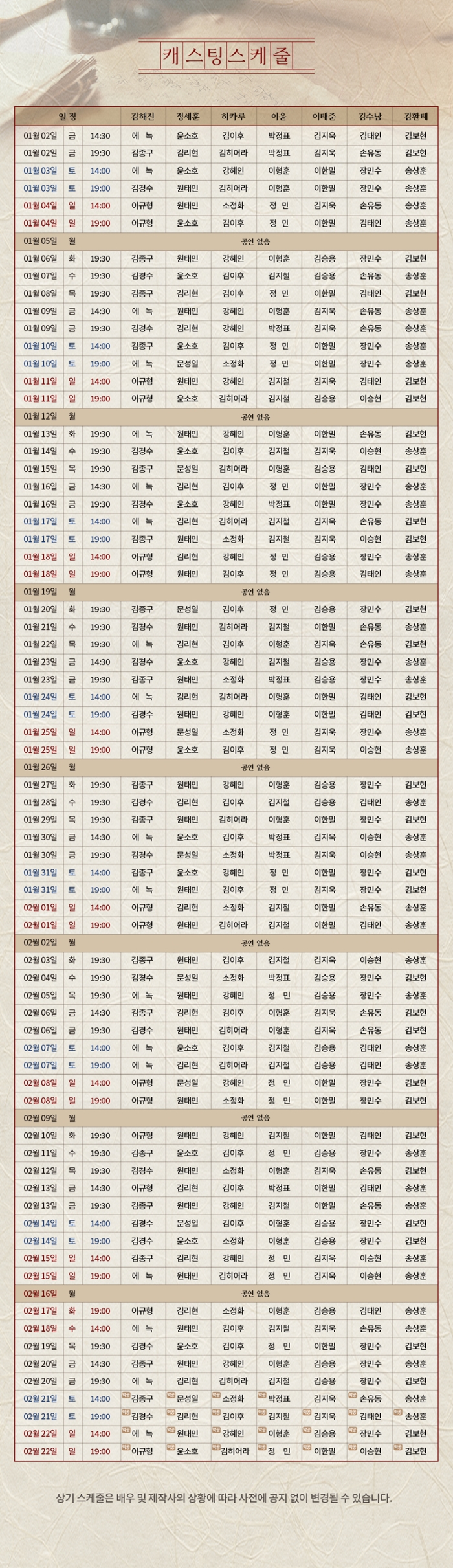 - 화, 수, 목 오후 7시30분 / 금 2시30분, 7시30분 / 토, 일 2시, 7시 (월 공연없음)