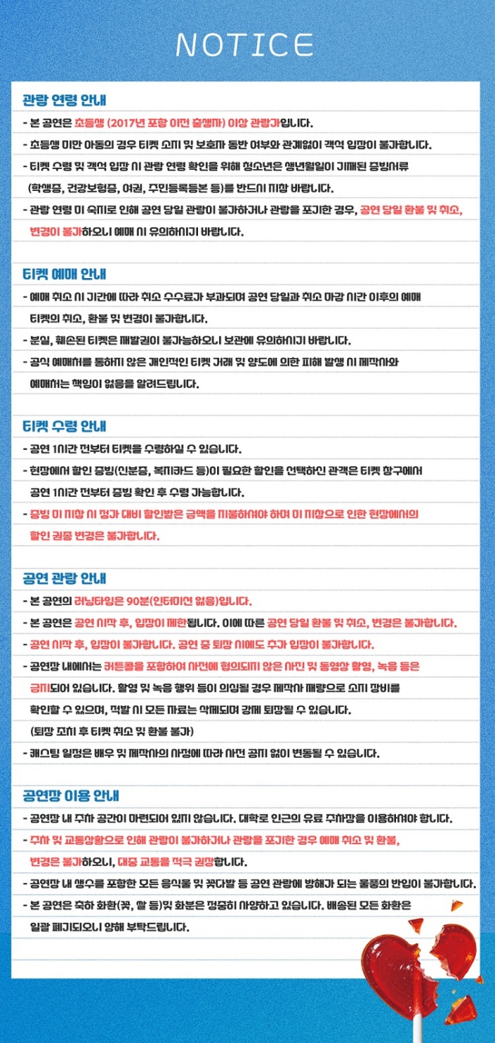 ※ 좌석배정은 회차별로 상이하며 당일 잔여석에서 현장선착순으로 배정됩니다. (좌석 지정 불가)