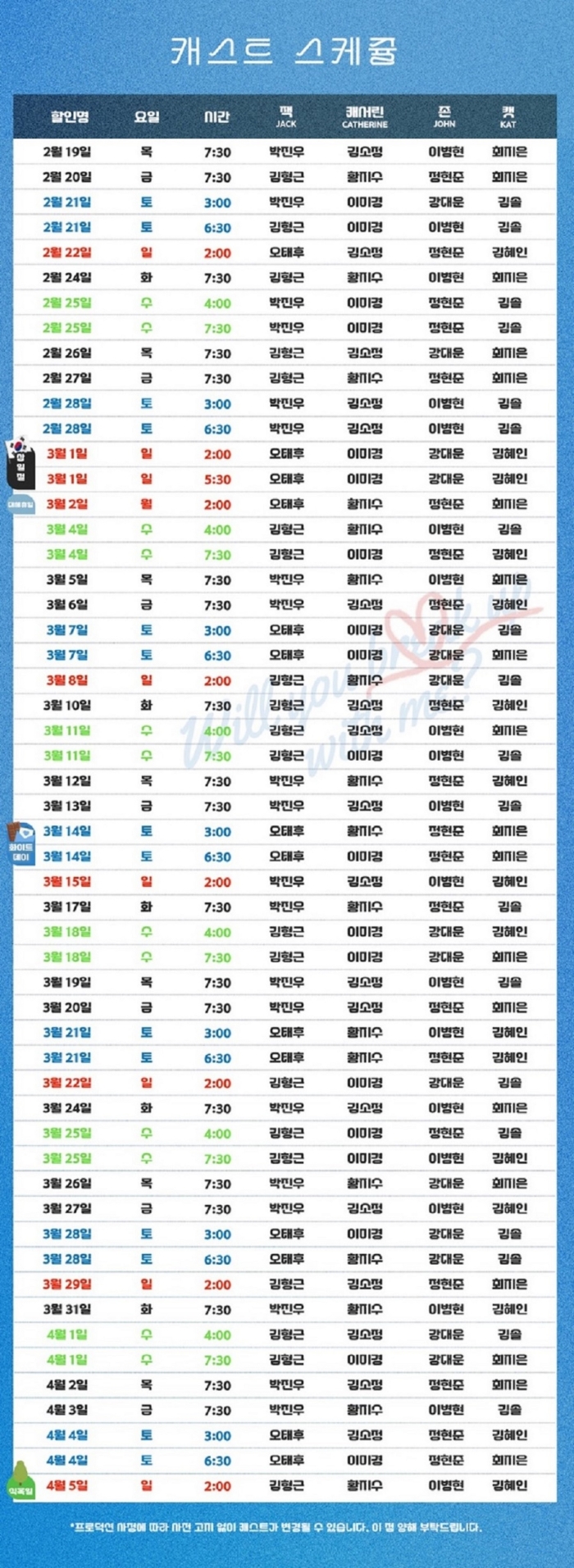 - 화, 목, 금 오후 7시30분 / 수 4시, 7시30분 / 토 3시, 6시30분 / 일요일, 공휴일 2시