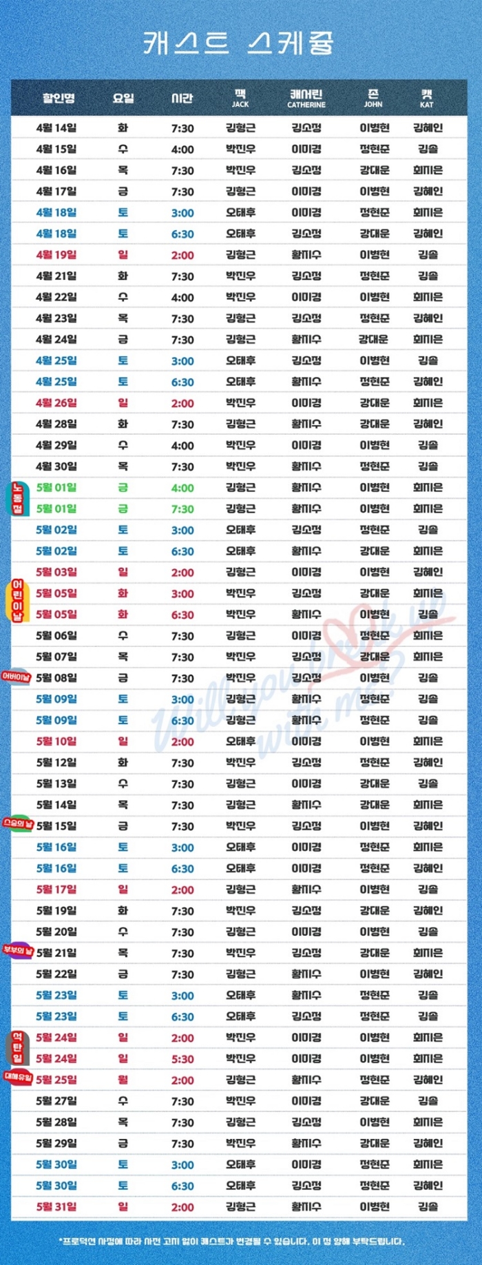 *04/22(수), 04/29(수) 오후 4시 *03/18(수), 03/25(수), 04/01(수), 05/01(금) 오후 4시, 7시30분