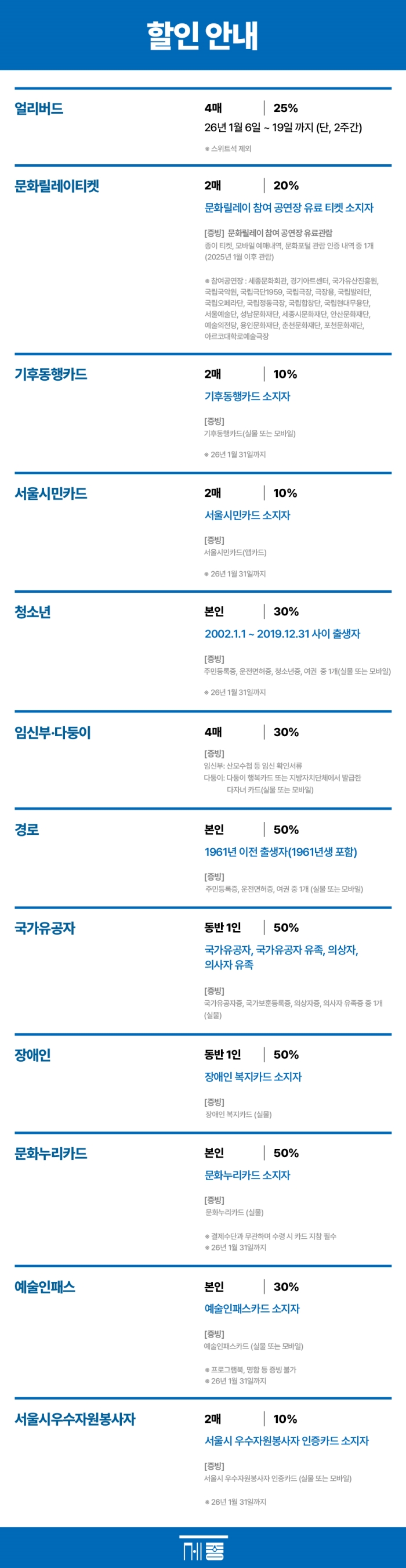 ∙ 취소마감시간 : 공연일 1일 전 오후 5시 / 공연일이 일요일, 월요일인 경우 토요일 낮 12시