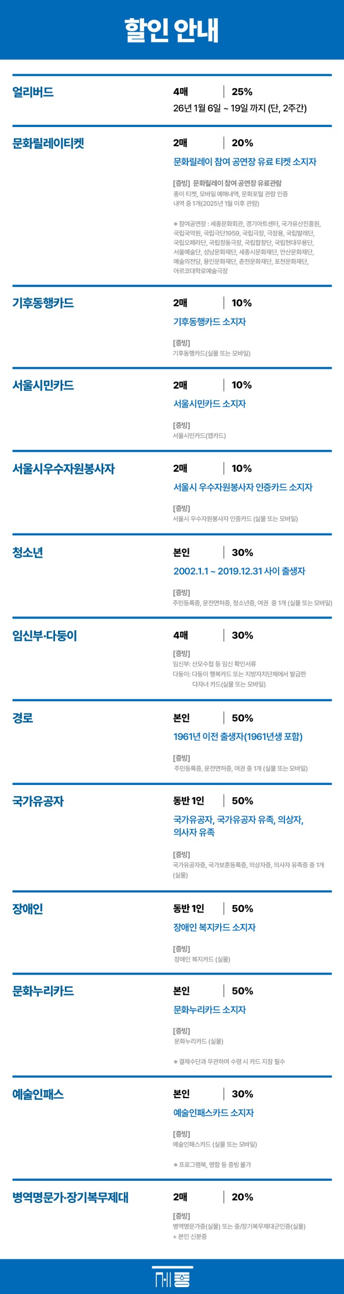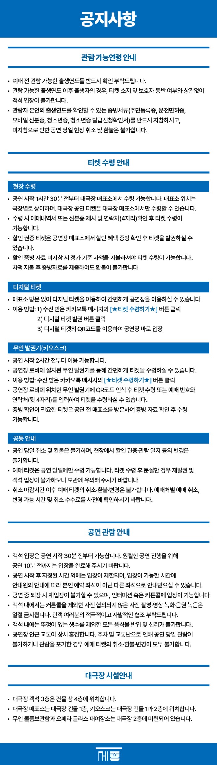∙ 취소마감시간 : 공연일 1일 전 오후 5시 / 공연일이 일요일, 월요일인 경우 토요일 낮 12시