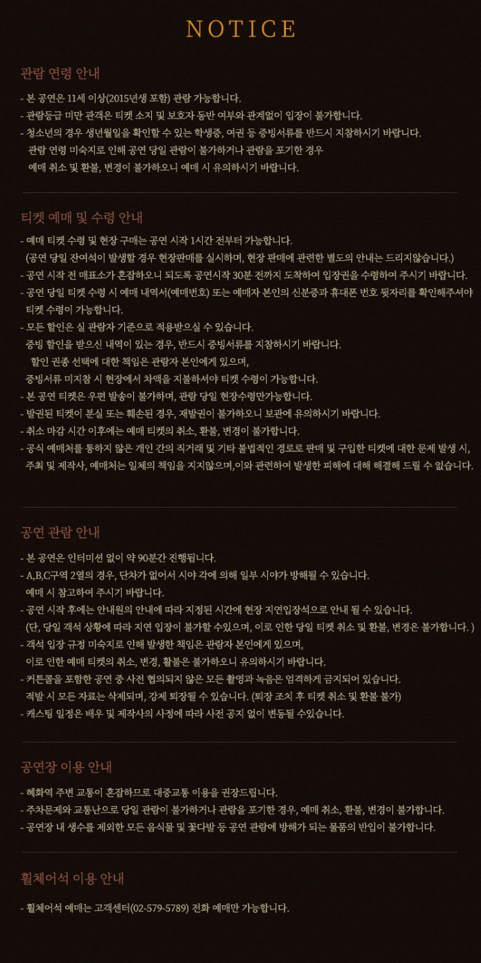 | 유효기간(이용조건) | 2026년02월14일(토) ~ 03월22일(일) (예매한 공연일시에 한해 이용 가능) | ||||||||