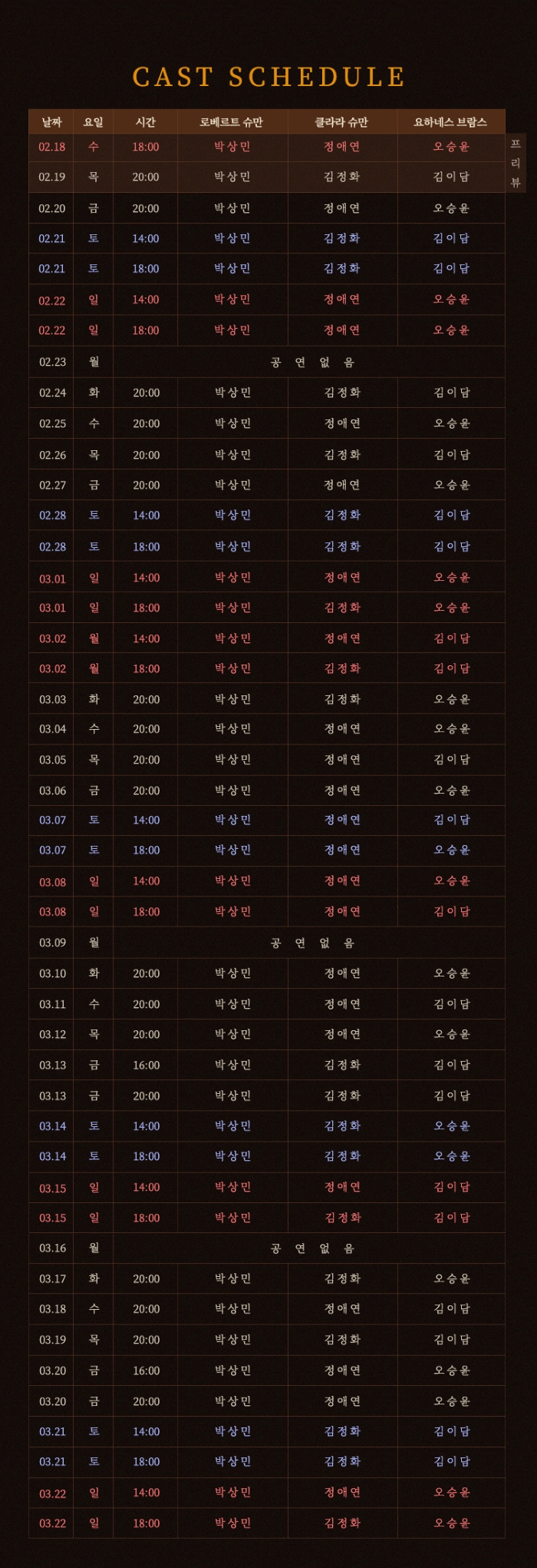 - 화~금 오후 8시 / 토, 일, 공휴일 2시, 6시
