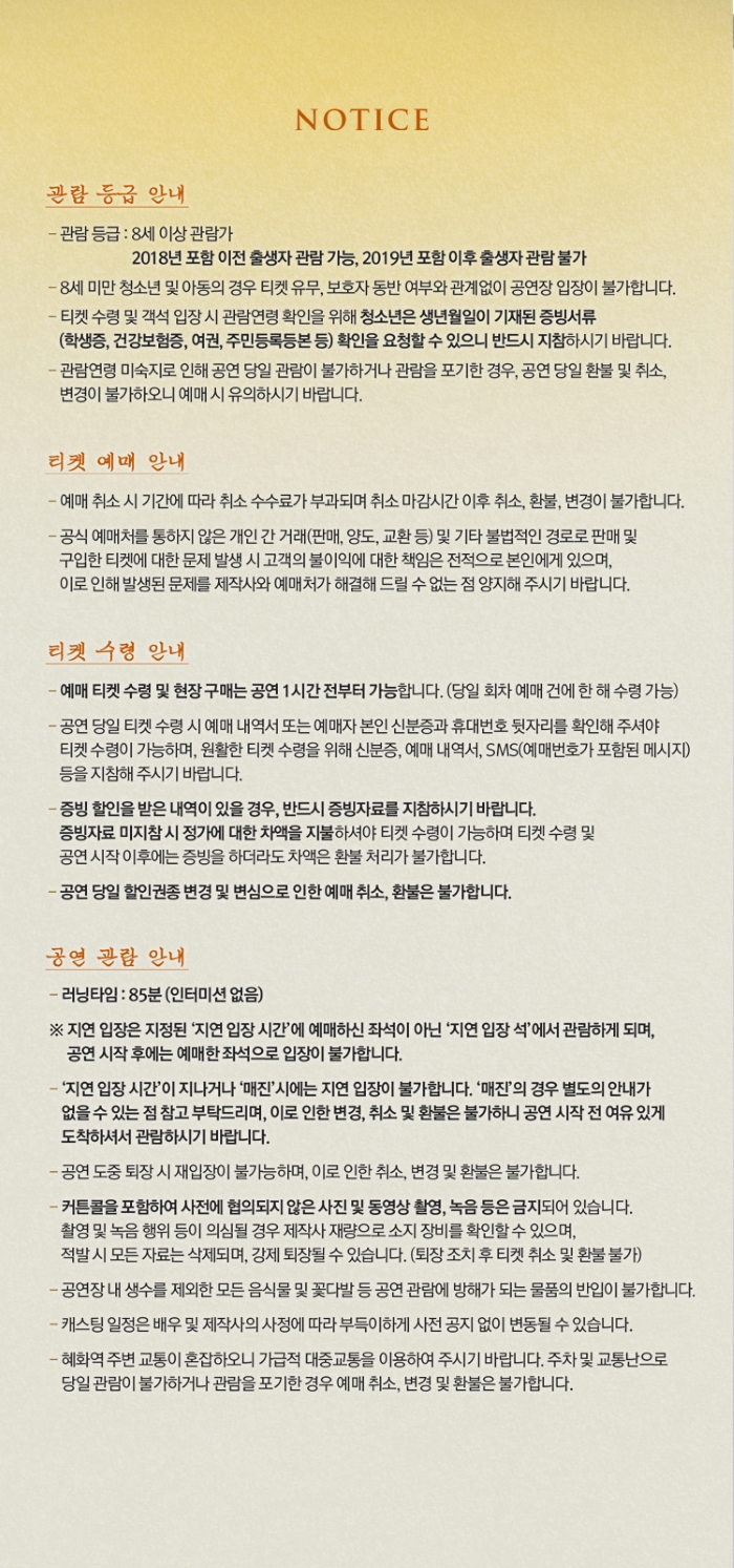 ∙ 취소마감시간 : 공연일 1일 전 오후 5시 / 공연일이 일요일, 월요일인 경우 토요일 낮 12시