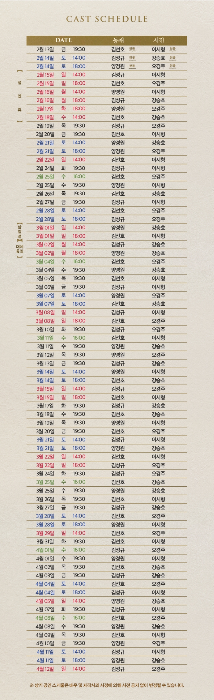 화, 목, 금 오후 7시30분 / 수 4시, 7시30분 / 토, 일 2시, 6시 (월 공연없음)