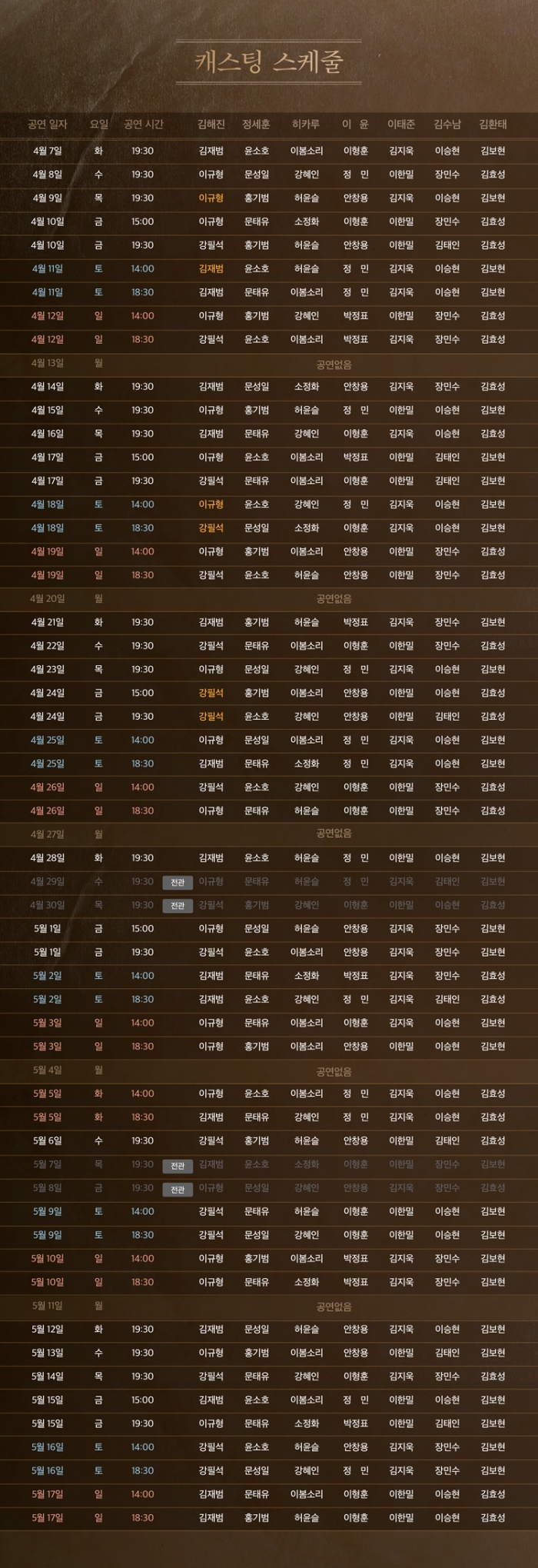 - 화, 수, 목 오후 7시30분 / 금 3시, 7시30분 / 주말 및 공휴일 2시, 6시30분 (월 공연없음)