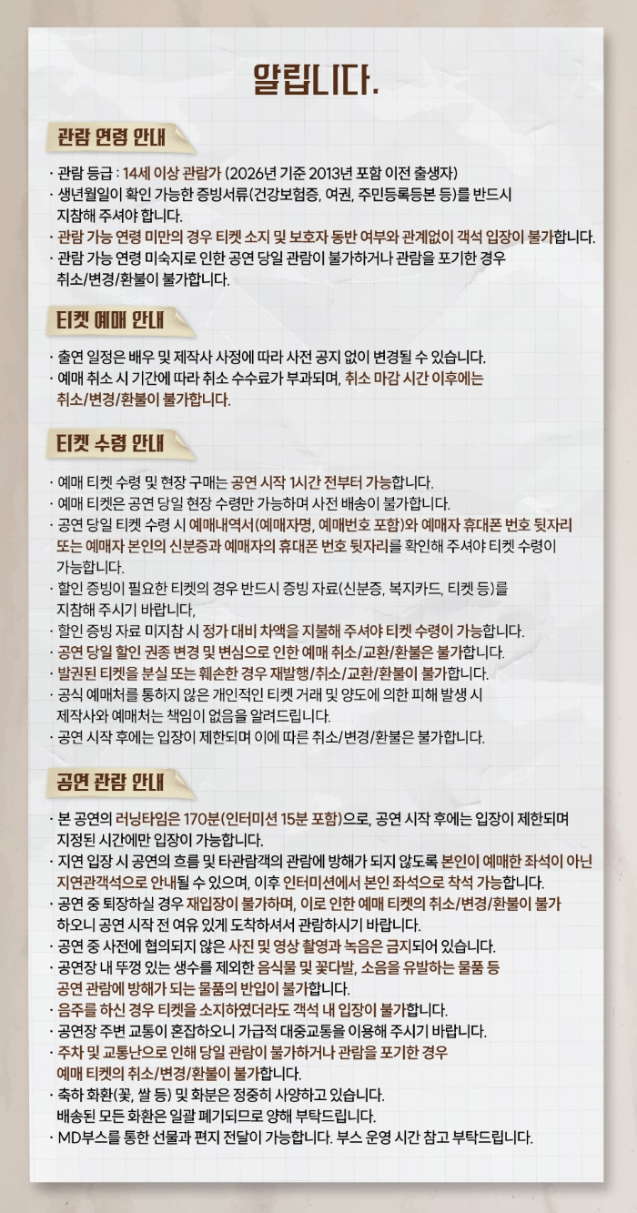 ∙ 취소마감시간 : 공연일 1일 전 오후 5시 / 공연일이 일요일, 월요일인 경우 토요일 낮 12시