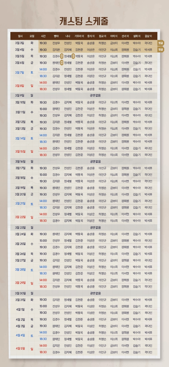 화, 목, 금 오후 7시30분 / 수 3시, 7시30분 / 토, 일 공휴일 2시, 6시30분 (월 공연없음)