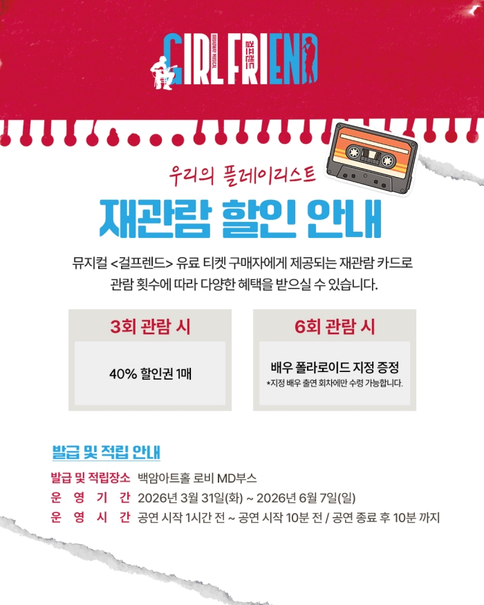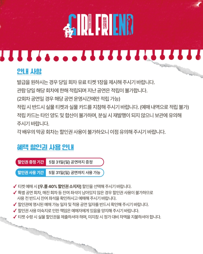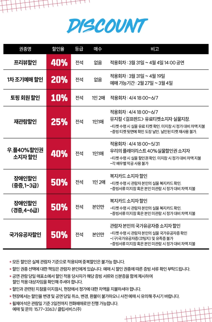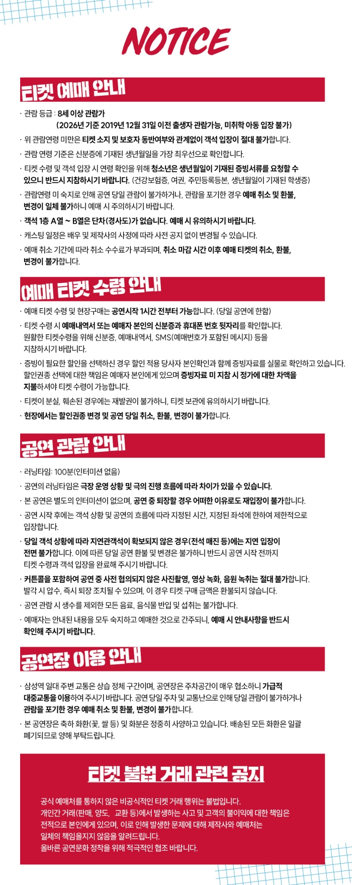 | 유효기간(이용조건) | 2026년03월31일(화) ~ 04월19일(일) (예매한 공연일시에 한해 이용 가능) | ||||||||