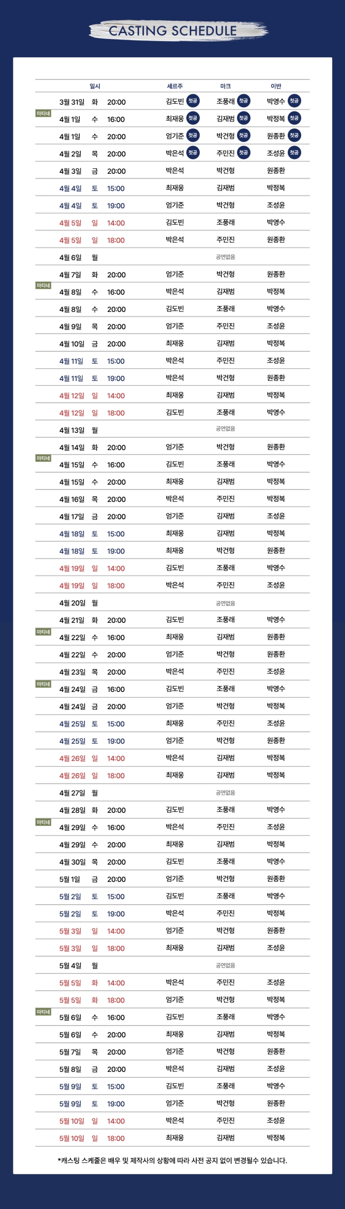 - 화, 목, 금 오후 8시 / 수 4시 8시 / 토 3시, 7시 / 일 및 공휴일 2시, 6시 (월 공연없음)