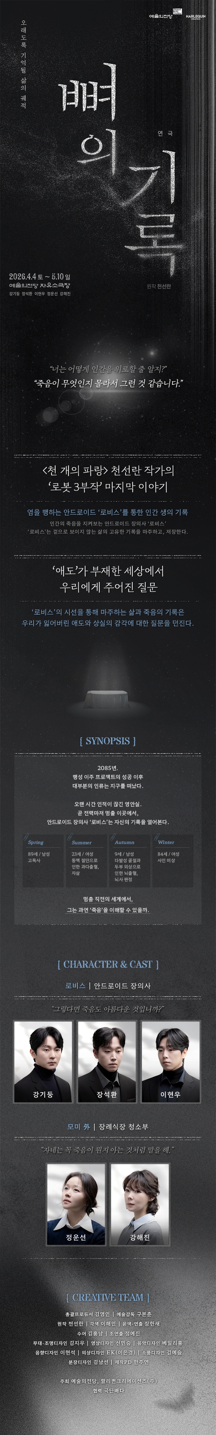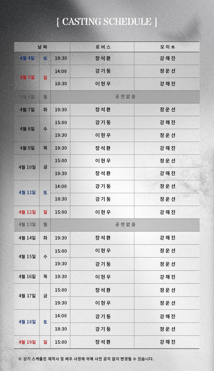 - 화, 목 오후 7시30분 / 수, 금 3시, 7시30분 / 토 2시, 6시30분 / 일 3시 (월 공연 없음)