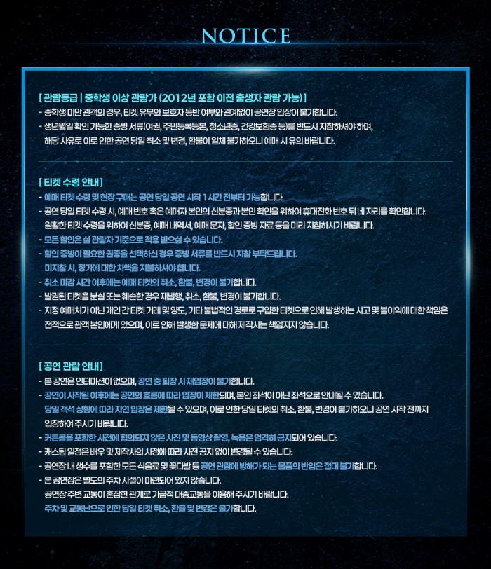 ※ 좌석배정은 회차별로 상이하며 당일 잔여석에서 예매선착순으로 배정됩니다. (좌석 지정 불가)